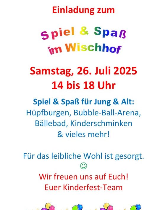 am 26. Juli ist wieder Kinderfest in Sierksrade auf dem Wischhof. Wir freuen uns auf einen tollen Tag mit euch mit Spiel, Spaß und Verpflegung.